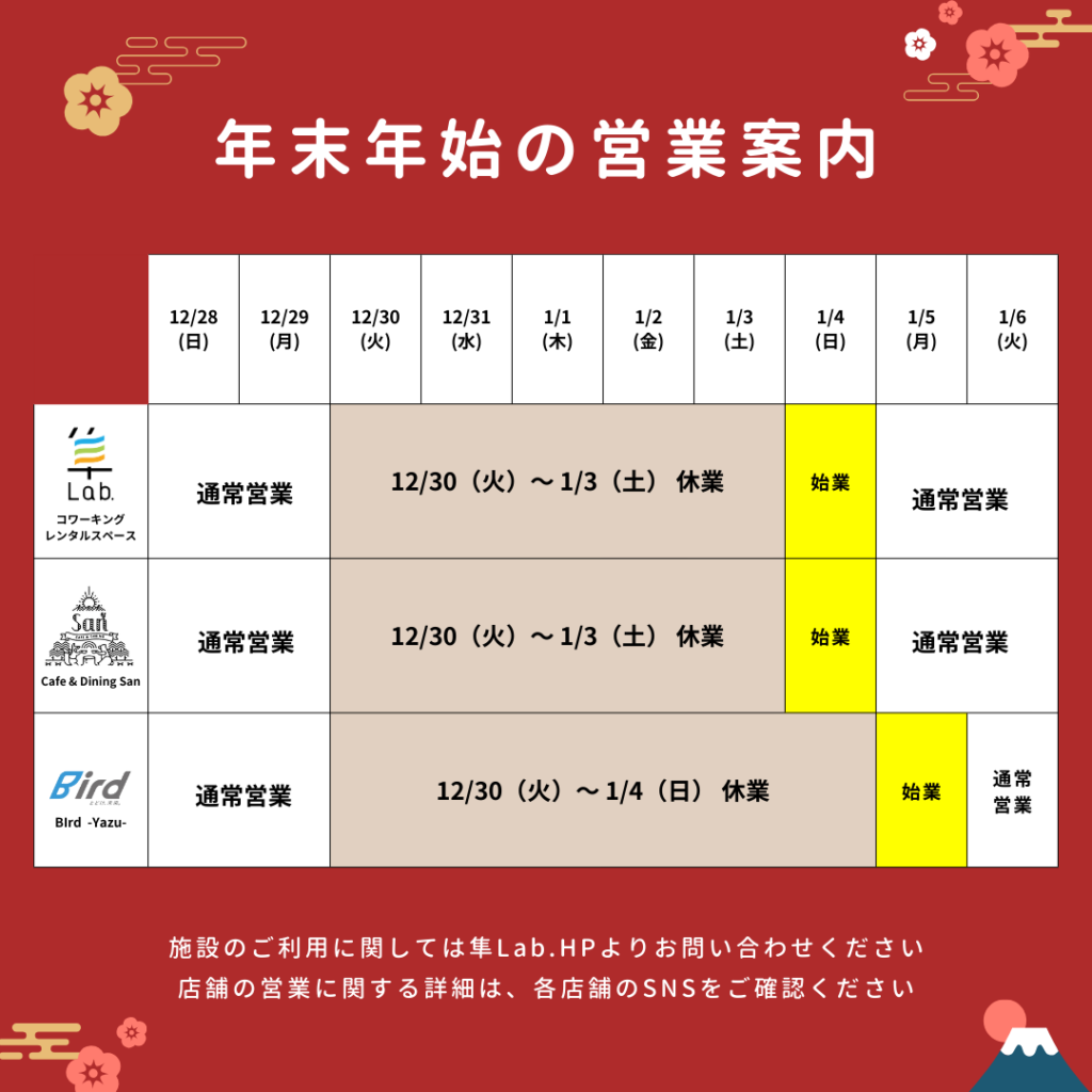隼Lab. および1F店舗の年末年始のスケジュールについてお知らせいたします。