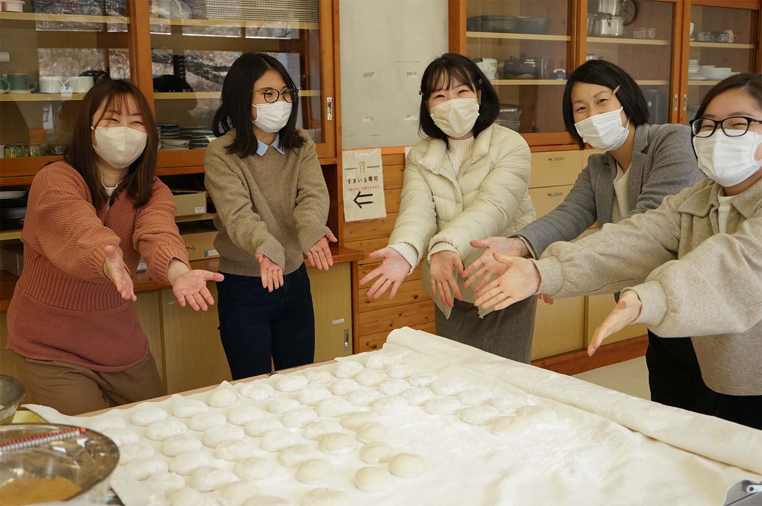 お餅の丸め方にはコツが必要。はじめて参加される方は、前回も参加された経験者の方にレクチャーしてもらいながら丸めていきましたよ。
