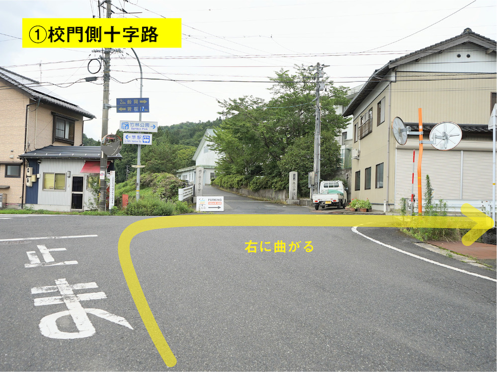 国道29号線方面から隼Lab.を目指すと、校門側の十字路に到着します。ここを右に曲がります。