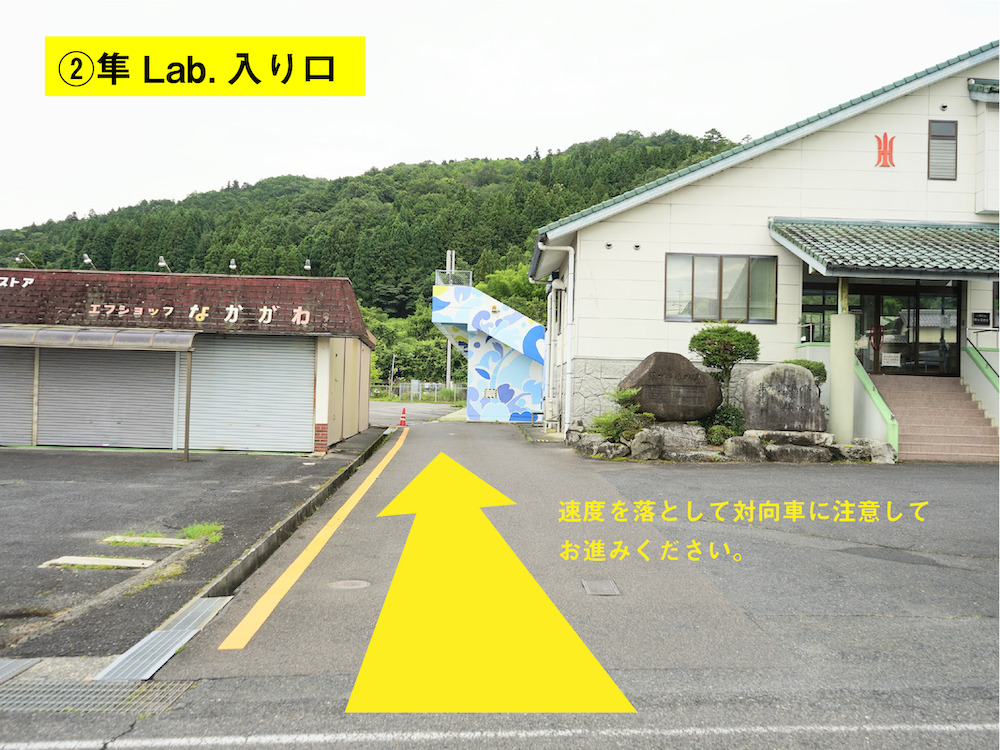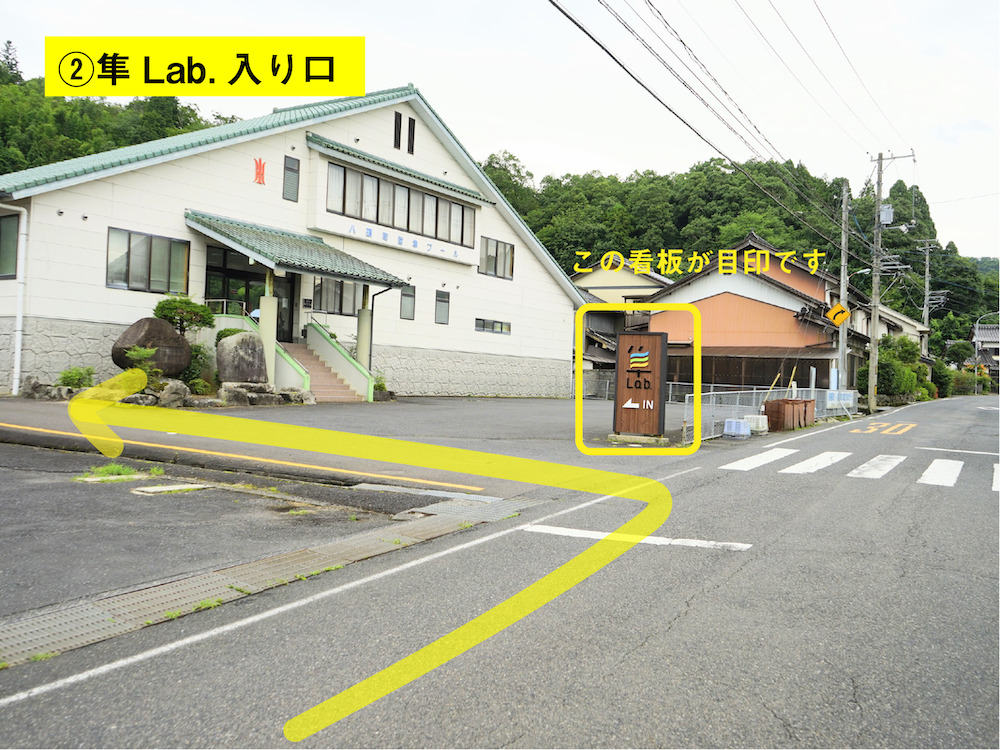 「八頭町営隼プール」と「エフショップなかがわ」の間を入ると、隼Lab.到着です。入り口は狭いので、速度を落として対向車に注意してお入りください。