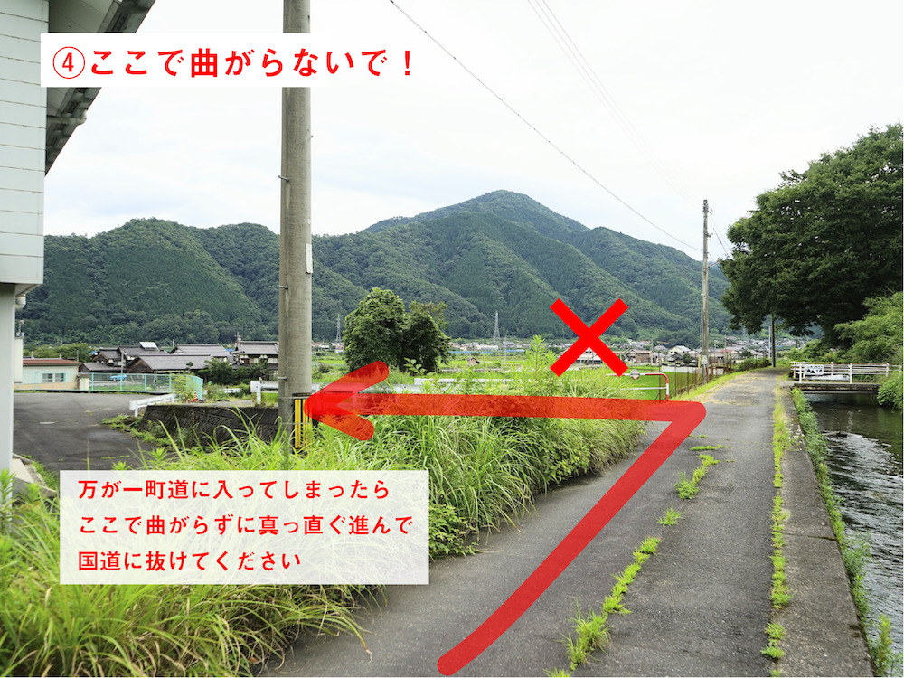 万が一誤って町道に侵入してしまった場合、ここで曲がらずに真っ直ぐ進んでください(国道482号線に抜けます)。