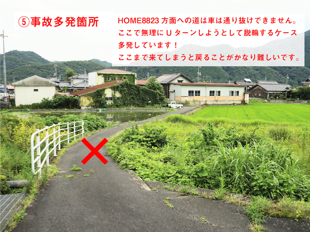 事故が多発している場所は、軽自動車でもUターンが難しいほどの細い場所です。道としてはHOME8823の裏手に繋がっていますが、車は通り抜けができません。かなり危険ですので、万が一町道に侵入してしまっても④の場所で体育館側に曲がらないでください!