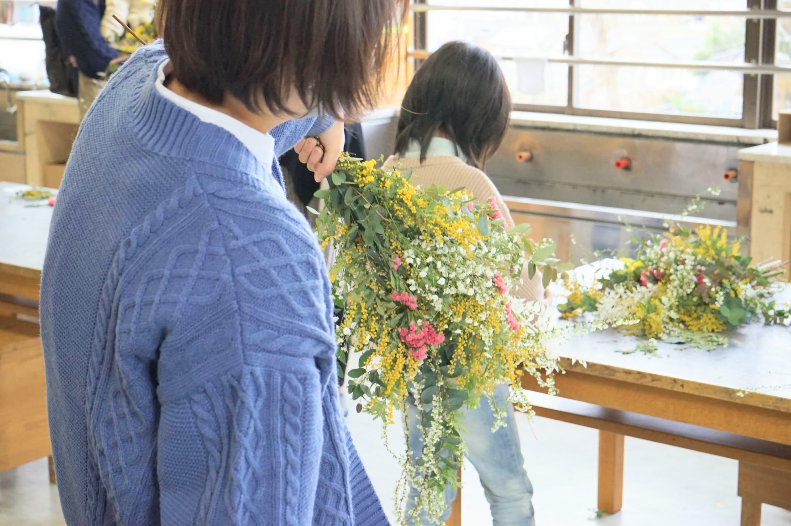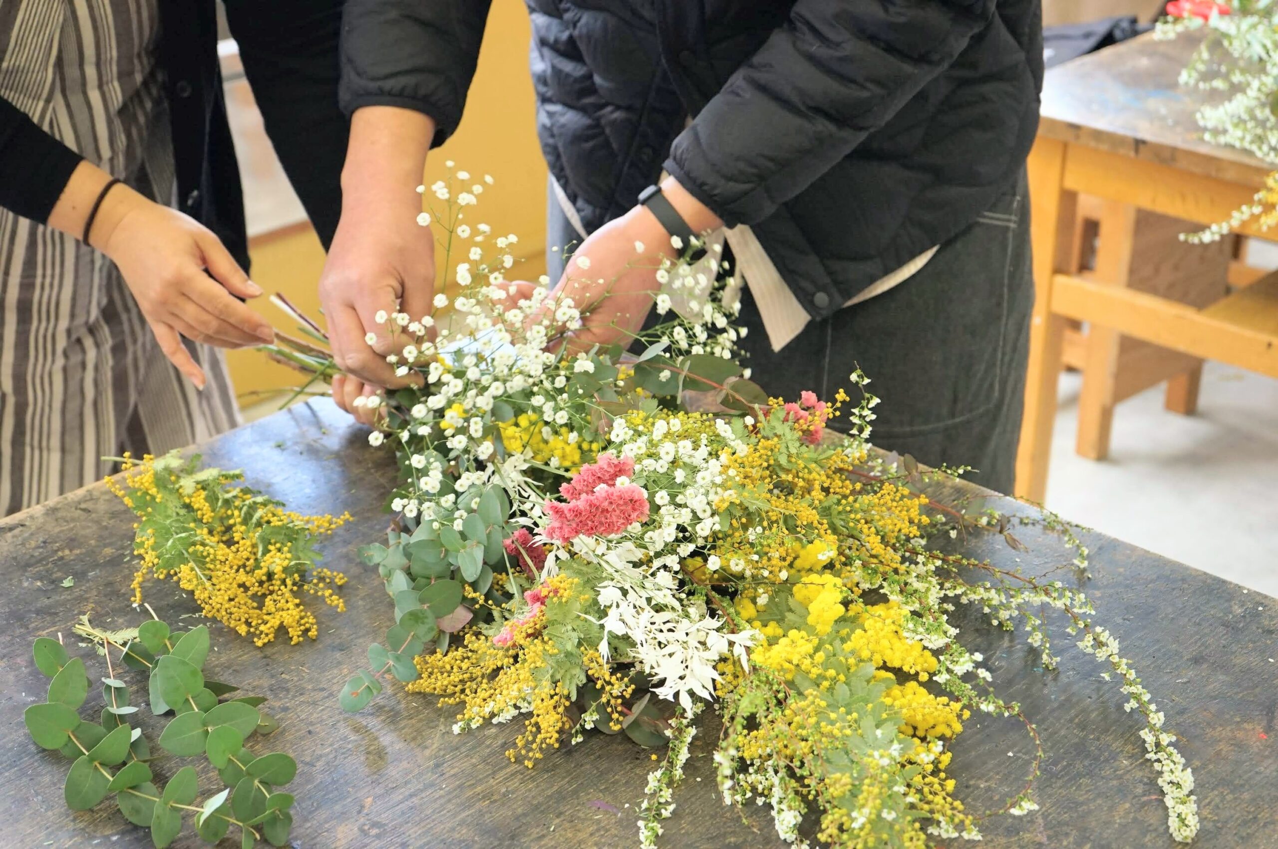 材料に、ひなまつりらしい桃色のスターチスや、アクセントになる黄色のミモザ、ユキヤナギ、ユーカリ、かすみ草をつかってスワッグを作成。