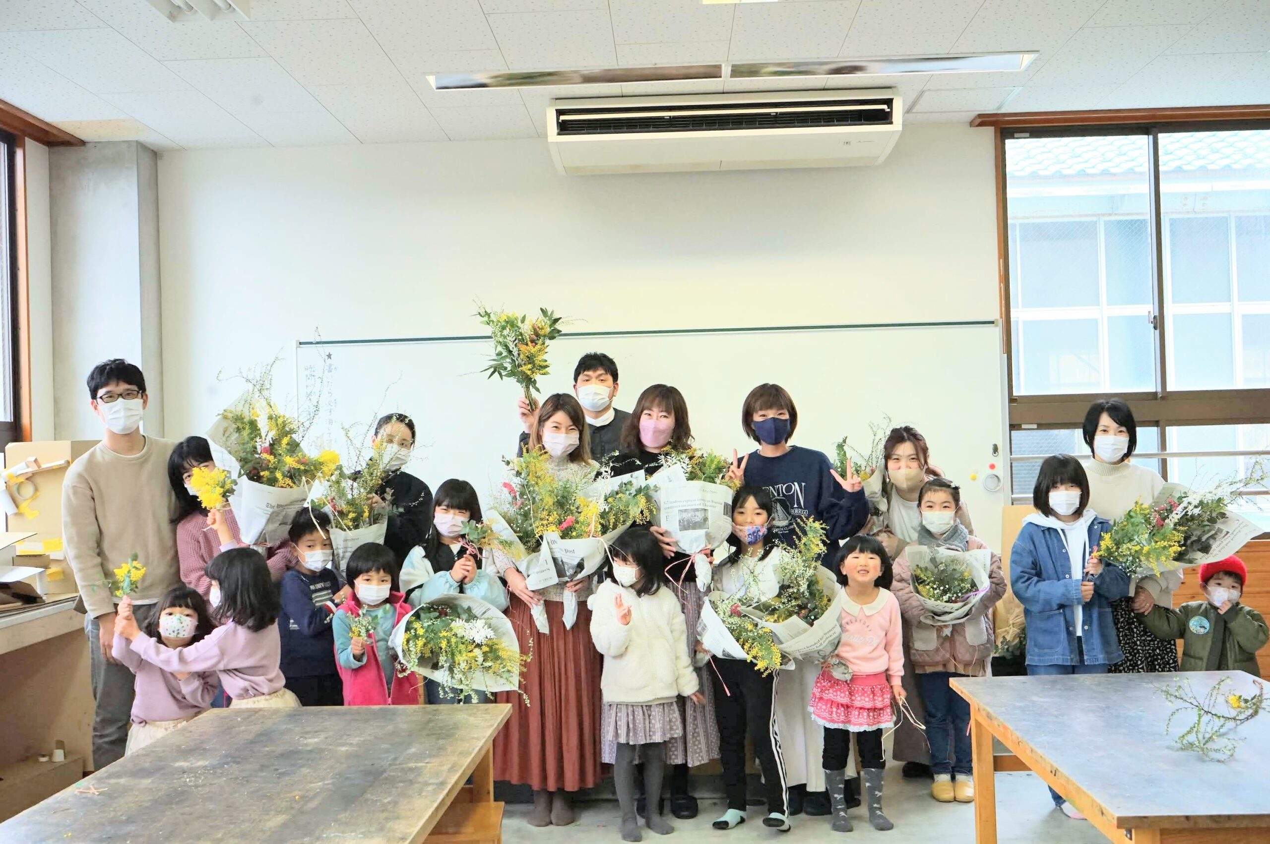 隼小学校の生徒たちが使ってきた年季の入った長い机に材料を広げ、めいっぱい活用しました。