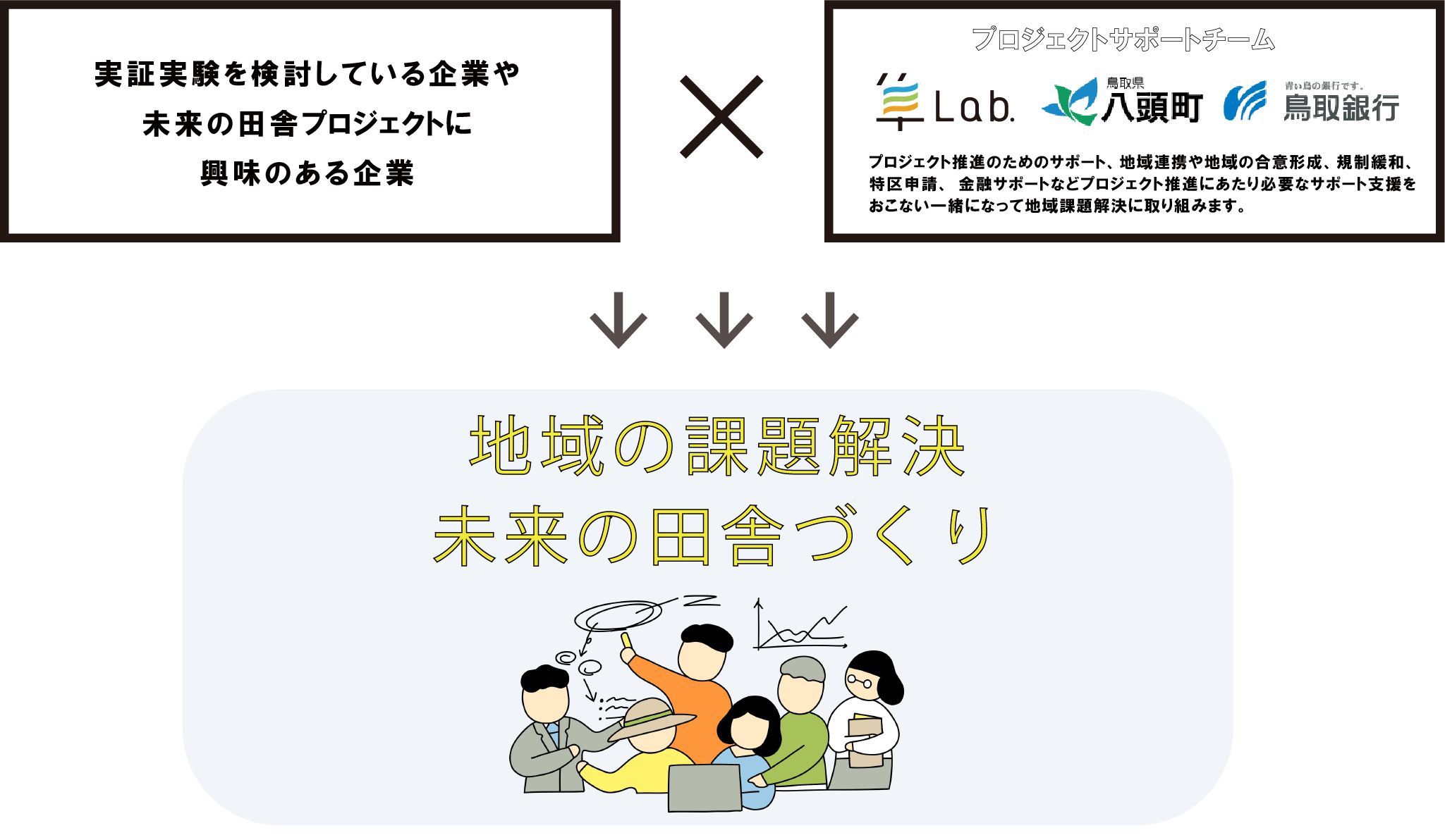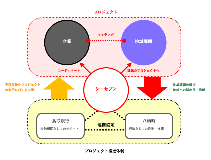 八頭町、隼Lab.を運営する株式会社シーセブンハヤブサ、同社への出 資・参画で起業創業のエコシステムの構築を目指す株式会社鳥取銀行 、三者の連携により、地域課題の解決に向けた取り組みをサポートす るためのプラットホームを構築し、行政・企業・金融機関それぞれの 立場から、持続可能な未来の田舎づくりを加速させます。