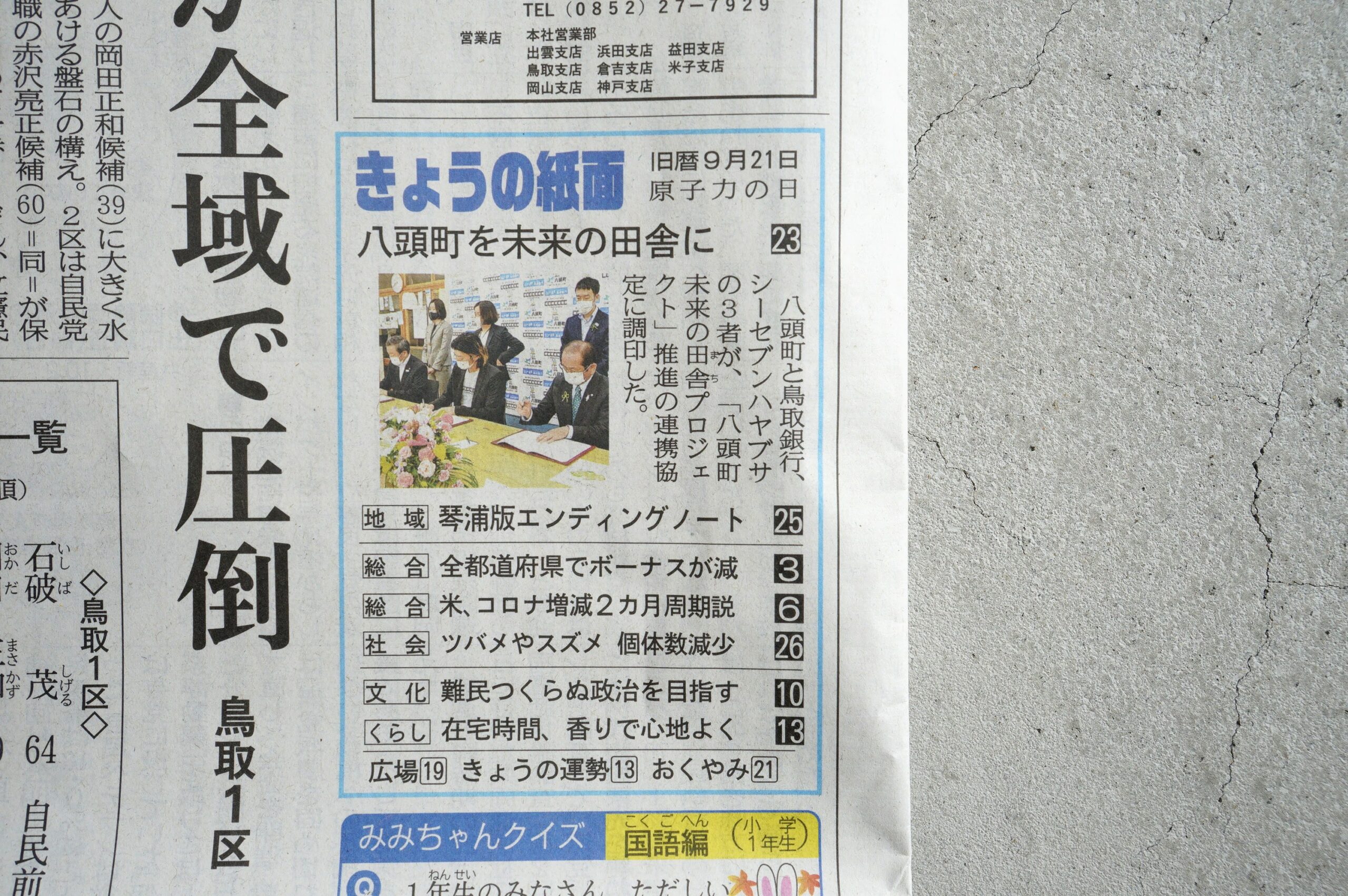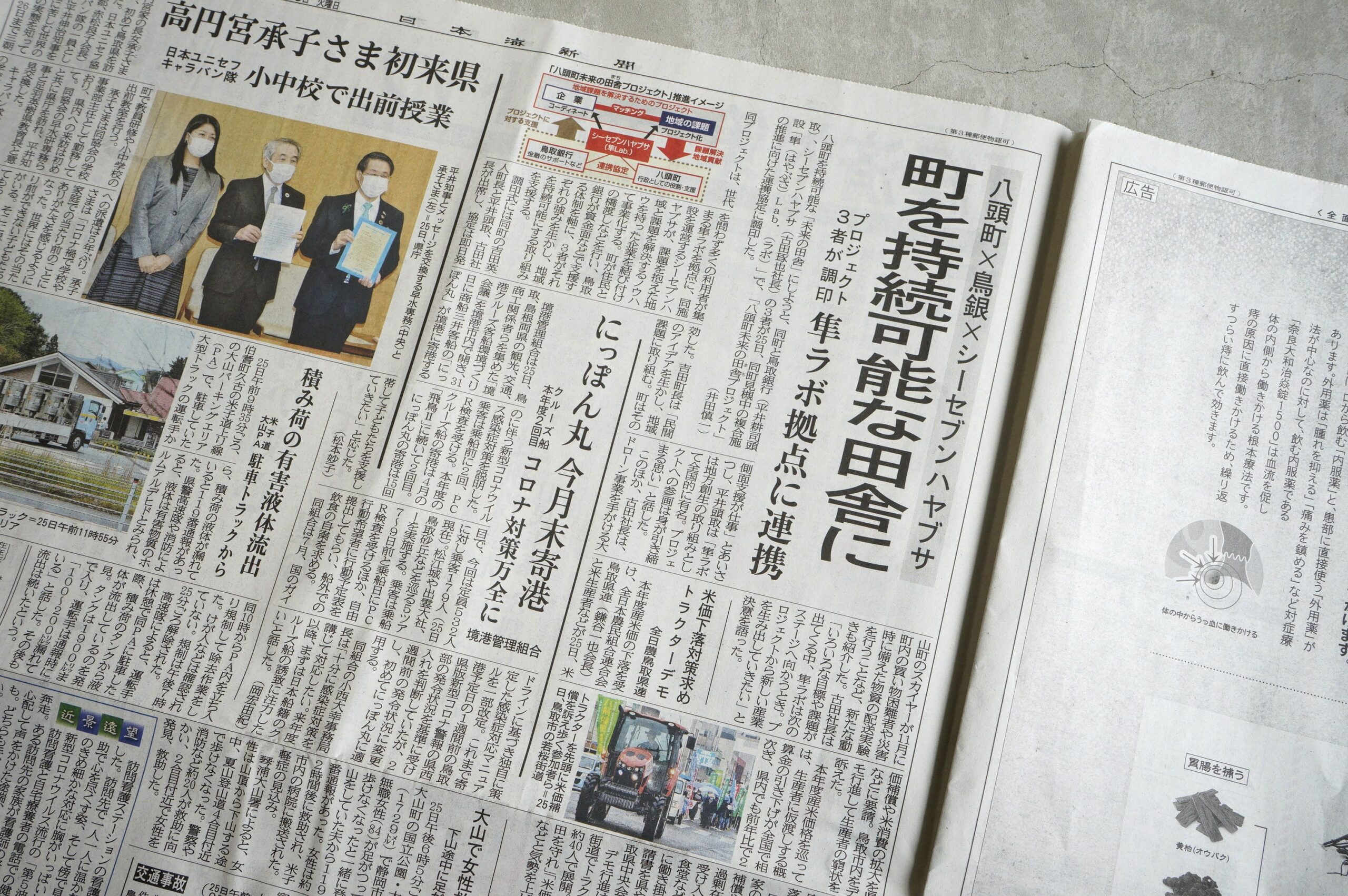 昨日、協定締結式が行われ、三者が共通ゴールとして目指す「未来の田舎」づくりに向けた協定について、各メディアでもご紹介いただいております。地元紙である日本海新聞では、本日10月26日(火)朝刊の1面、23面に取り上げていただきました。