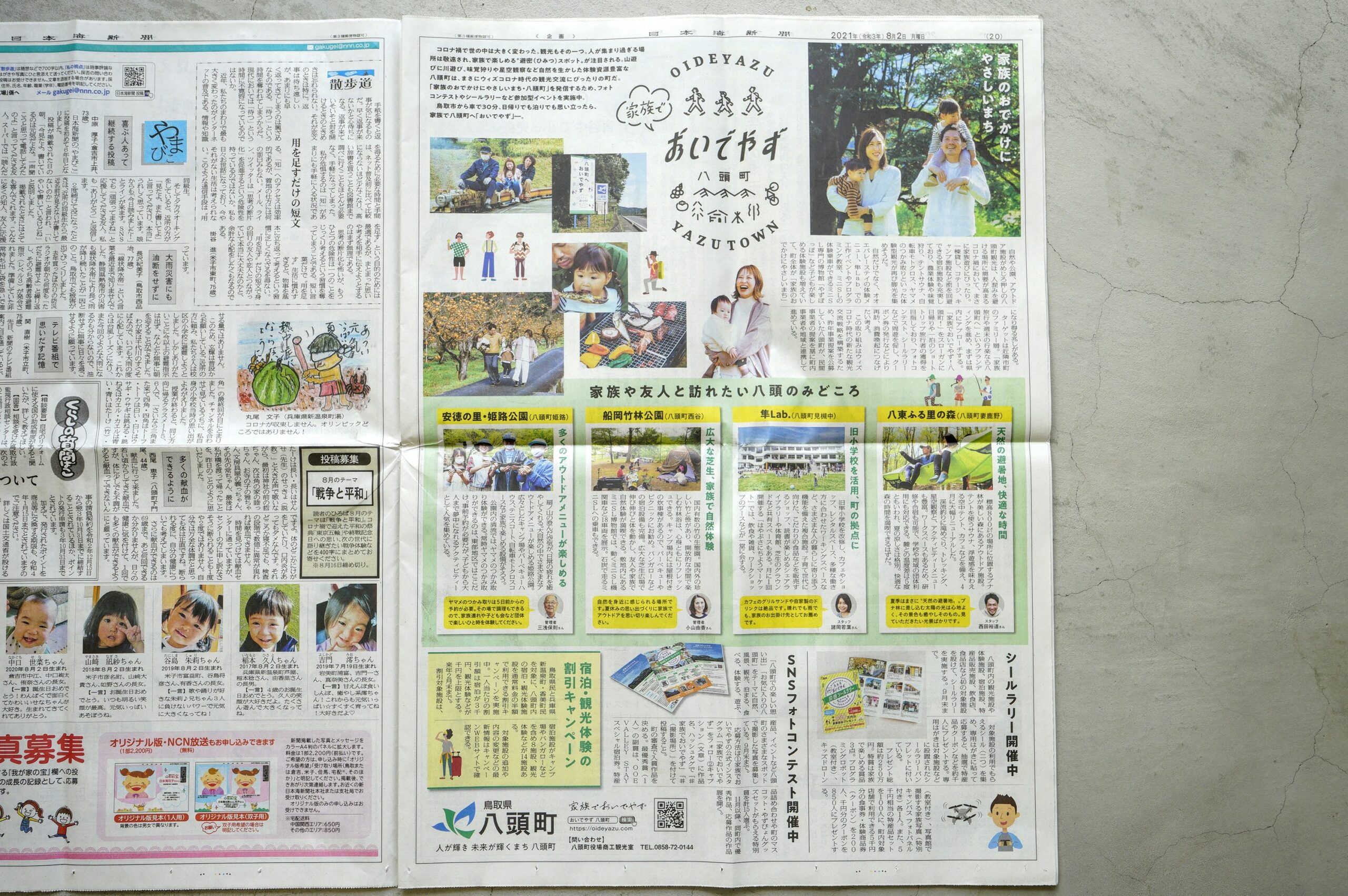 本日の日本海新聞朝刊に、片面カラー1Pで「家族でおいでやず 八頭町」が特集されています。家族で楽しめるスポットとして、隼Lab.も掲載いただきました。八頭町の美味しい名産品や、楽しい体験メニューが賞品のシールラリーや、フォトコンテストも開催中です。